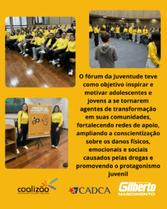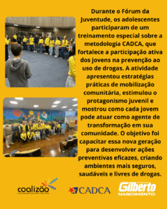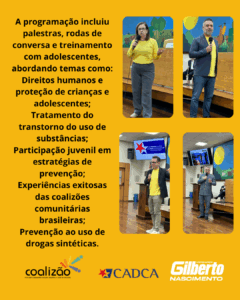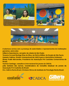 A iniciativa é uma realização da Coalizão Brasil, com apoio da CADCA e do vereador Gilberto Nascimento, reforçando a importância da união entre sociedade civil, governo e juventude para a construção de uma comunidade mais saudável e resiliente.