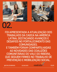 Segundo representantes da CADCA e da Associação, momentos como este são essenciais para ampliar a visibilidade do trabalho das coalizões, fortalecer parcerias e garantir a sustentabilidade das ações de prevenção em todo o território nacional.