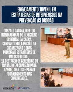 O evento contou com a presença do Diretor Internacional do Hemisfério Ocidental da CADCA, Gonzalo Cadima, que apresentou o escopo de atuação da organização e suas principais estratégias globais. Cadima destacou os benefícios do trabalho em coalizão, ressaltando como a participação de jovens fortalece comunidades, amplia resultados e promove soluções sustentáveis.