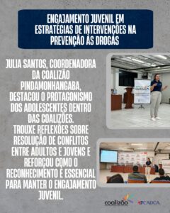 Entre os convidados nacionais, Damião Avelino da Silva, coordenador da Coalizão Itanhaém, apresentou estratégias práticas de recrutamento e apoio aos jovens, enfatizando a importância da parceria entre adultos e adolescentes no processo de prevenção. Já Julia Santos, coordenadora da Coalizão Pindamonhangaba, abordou o protagonismo juvenil nas coalizões, trazendo reflexões sobre resolução de conflitos entre gerações e destacando a importância do reconhecimento dos adolescentes para manter o engajamento.