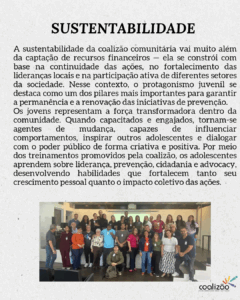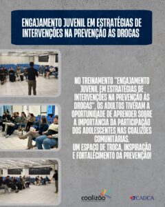 Nos últimos meses, a coalizão investiu em treinamentos voltados para adolescentes, capacitando jovens líderes para atuarem como multiplicadores da prevenção em escolas, bairros e espaços públicos. Durante as formações, os participantes aprendem sobre os riscos do uso de álcool e outras drogas, desenvolvem habilidades de liderança e comunicação, e são incentivados a propor projetos que promovam ambientes mais saudáveis e seguros.